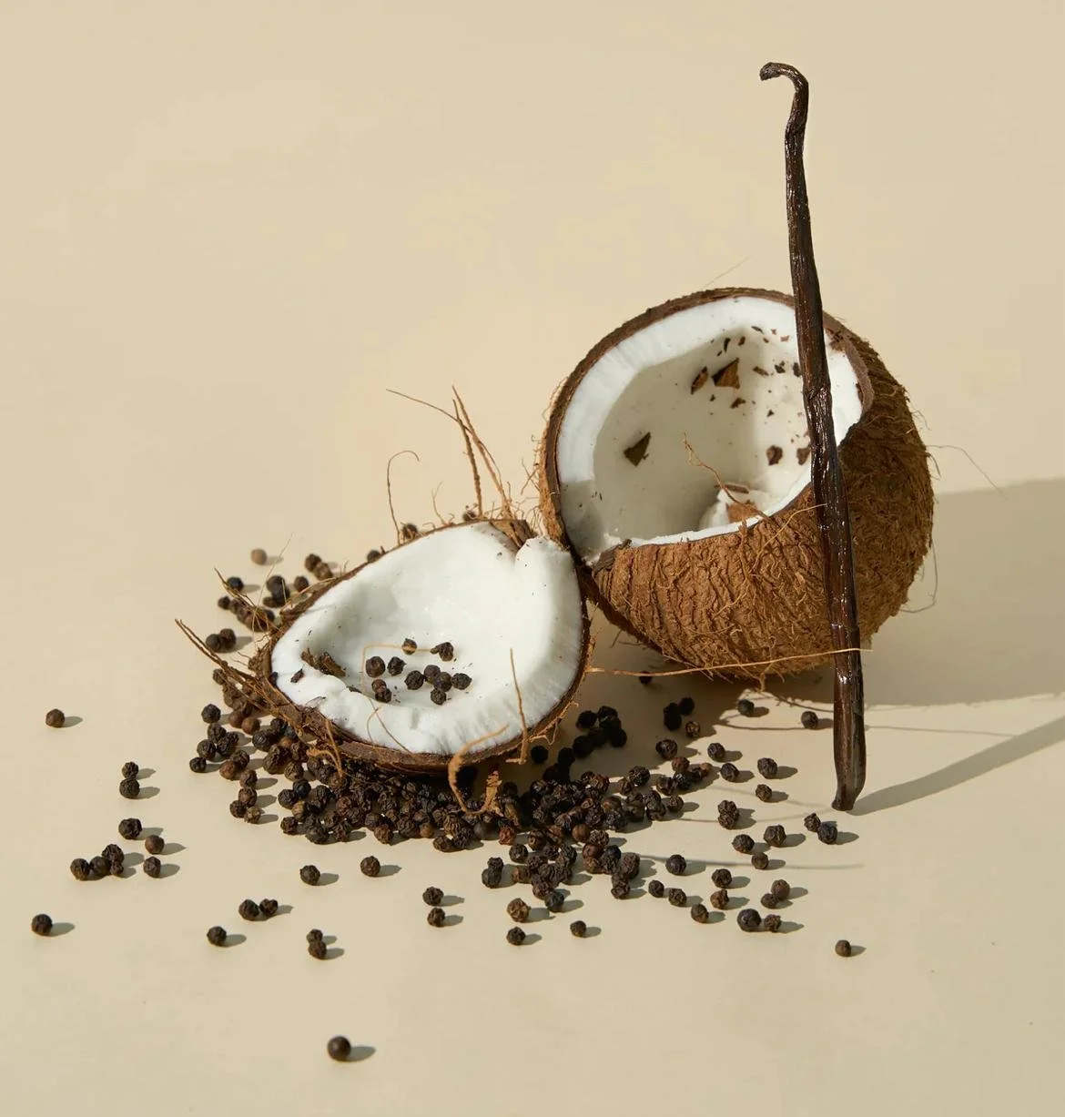 Black Coconut is a bold scent that blends creamy coconut with black pepper, sandalwood, and tonka. Juicy pear and soft florals add depth, making it irresistibly appealing.
